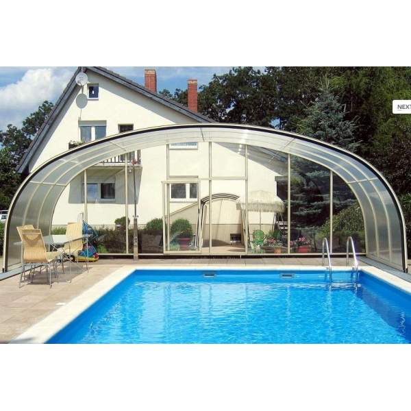 Класическая высокая конструкция раздвижного павильона для бассейна "Лагуна", позволяет ходить под павильоном в полный рост. Павильон «Лагуна» отличается максимальным использованием его внутреннего пространства по всей длине бассейна - идеальное решение для обустройства купального зала. Как любой павильон он за счет парникового эффекта значительно увеличивает купальный сезон, защищает бассейн от загрязнений, атмосферных осадков и домашних животных. А так же в солнечную погоду в закрытом состоянии нагревает воду бассейна.