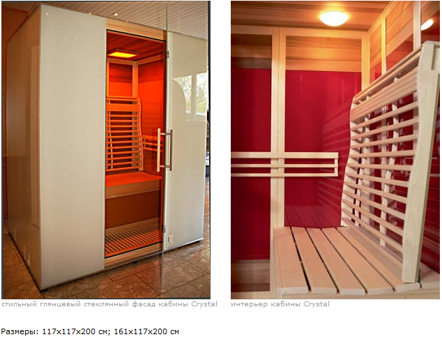 Кабины серии Crystal являются модификацией легендарной серии Royal, успешно зарекомендовавшей себя во всем мире. Отличительной особенностью данной серии является внутренняя отделка не только красным канадским кедром, но и стеклянными элементами, благодаря которым кабина быстрее нагревается и выходит на режим работы. Также были внесены изменения в ограничители для спины и лавки, теперь они более эргономичны и доставляют больше удобств при приеме процедур. Стеклянные элементы по желанию заказчика могут иметь любую цветовую гамму*.