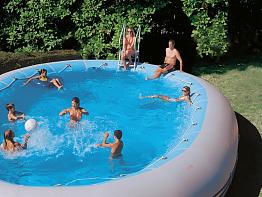 Вода в бассейн заливается через верх с помощью шланга. Слив бассейна осуществляется самотеком.